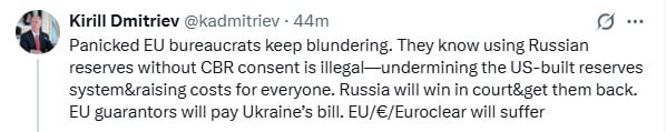 Они знают, что использование российских резервов без согласия Банка России незаконно - это подрывает созданную США резервную систему и увеличивает издержки для всех. Россия выиграет в суде и вернет их... ЕС, евро и Euroclear пострадают. "